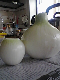 先程、夕飯の支度をしようと台所に入ってきた母が、 変わったものを見せてくれました。 それがこの写真です。 一見普通の玉ねぎのように見えますが、 普通の大きさの玉ねぎは左側です(多少小ぶりですが)。 その2倍はある右側の巨大な玉ねぎ、ハンドボール級の大きさです。 なんでも、近所の人からもらったものらしいです。 サラダ用で、生で食べれるらしいです。 多少分かりにくいかもしれませんが、 携帯で撮ってみたので、余計に画質が悪いかんじですね。 たまには、写真を掲載するのもいいかもしれません。 うーん、大きかったな。 では、次の更新日まで。